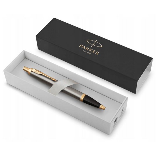 Elegancki długopis kulkowy Parker IM w kolorze szarym z wykończeniami GT (złotymi) to połączenie klasyki i nowoczesnego designu. Wygodny w użytkowaniu, idealny zarówno do biura, jak i na prezent.
