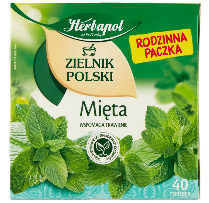 Herbata HERBAPOL Mięta z linii Zielnik Polski to w 100% naturalny napar z liści mięty pieprzowej, znanej ze swoich prozdrowotnych właściwości. Wspiera trawienie, łagodzi uczucie ciężkości i wspomaga naturalne funkcjonowanie układu pokarmowego. Jednocześnie działa odprężająco, pomagając wyciszyć organizm i odzyskać równowagę.
