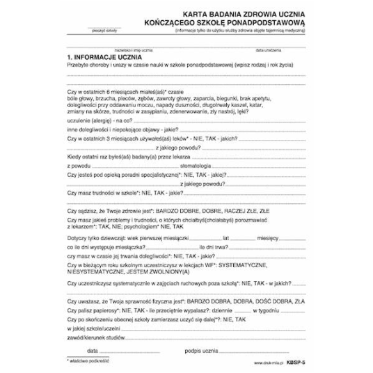 ✅ Karta badania zdrowia ucznia kończącego szkołę ponadpodstawową