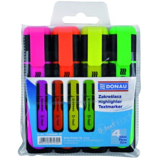 Zestaw czterech zakreślaczy Donau do znaczenia tekstu na praktycznie każym rodzaju papieru.