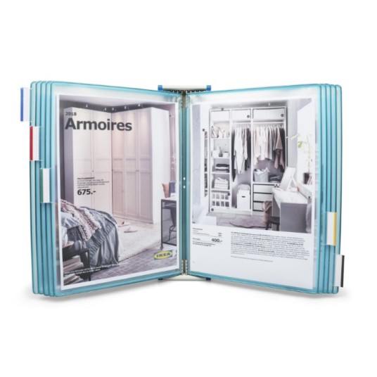- system składa się z 10 obrotowych paneli prezentacyjnych w danym kolorze, 5 zakładek indeksujących oraz materiałów montażowych