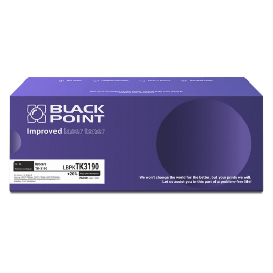 Toner Black Point LBPKTK3190 to wydajny, profesjonalny zamiennik oryginalnego wkładu Kyocera TK-3190, stworzony z myślą o intensywnej eksploatacji w biurach, firmach i instytucjach. Zapewnia wysoką jakość wydruków, stabilną pracę urządzenia oraz bardzo dużą wydajność do 25 000 stron, przy zachowaniu pełnej kompatybilności z drukarkami Kyocera ECOSYS.