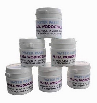 Pasta wodoczuła przeznaczona jest do wykrywania wody (H2O) w zbiornikach zawierających paliwa lub inne pochodne ropy naftowej, w zbiornikach z węglowodorami, z kwasem siarkowym, azotowym, amoniakiem, roztworami mydeł, roztworami soli i roztworami chloru