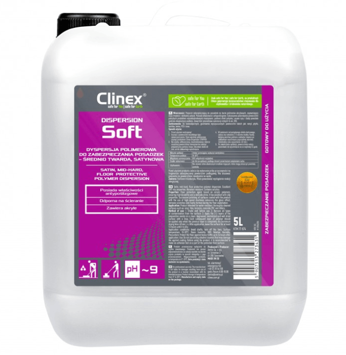 Clinex Dispersion Soft to dyspersja polimerowa do zabezpieczania posadzek, która tworzy trwałą, elastyczną warstwę ochronną o delikatnym połysku. Preparat poprawia odporność podłoża na ścieranie i ułatwia codzienne utrzymanie czystości. Warstwa ma właściwości antypoślizgowe, co podnosi bezpieczeństwo w intensywnie użytkowanych strefach. Regularne polerowanie maszynami wysokoobrotowymi zwiększa połysk i pomaga niwelować drobne rysy oraz ślady eksploatacyjne. Środek sprawdza się w obiektach usługowych, biurowych i edukacyjnych, gdzie wymagana jest estetyka i szybkie czyszczenie. Zawartość substancji stałych ok. 20% sprzyja budowaniu równomiernego, trwałego filmu ochronnego. Pojemność 5 l wystarcza na zabezpieczenie dużych powierzchni.