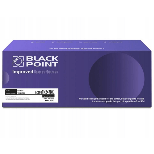 Wysokiej jakości czarny toner Black Point LCBPBTN247BK – zamiennik TN-247BK – zapewnia niezawodne działanie i idealną czerń w każdym wydruku. To gotowy do użycia wkład, który wystarczy włożyć do drukarki, aby od razu rozpocząć pracę. Bezproblemowy montaż, pełna kompatybilność i solidna, bezpieczna konstrukcja zapakowana w ochronny worek typu airbag.